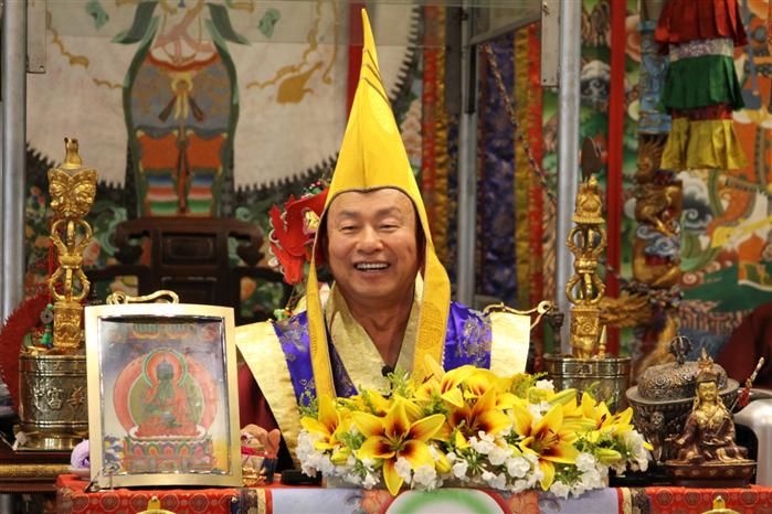 Hari ini kita mengadakan homa Buddha Amoghasiddhi, yidam yang satu ini jarang diketahui orang. Namun, Ia sangat penting. Mengapa penting? Lihatlah, susunan-Nya dalam tubuh manusia sangat penting, 5 Buddha 5 cakra 5 vajra, Vairocana di tengah berada di cakra kening, di cakra tenggorokan adalah Amitabha di Barat, di cakra hati adalah Buddha Akshobya di timur, di cakra pusar adalah Buddha Ratnasambhava di selatan, di cakra kemaluan adalah Buddha Amoghasiddhi di utara. Oleh karena itu, Buddha Amoghasiddhi sangat penting. Buddha Amoghasiddhi di utara adalah lambang dari Anusthana-jnana, yang berarti mencapai keberhasilan semua kebijaksanaan. Buddha Amoghasiddhi yang satu ini menguasai bagian karman. Apa yang dimaksud bagian karman? Di dalam ritual Tantra, 4 keberhasilan agung adalah tolak bala, kemakmuran, keharmonisan, penaklukan, Buddha Amoghasiddhi menguasai sadhana 4 keberhasilan agung, yang kita mohon, dalam ritual tidak akan sia-sia, dengan kata lain, permohonan akan terkabulkan. Acarya Lianyin berkata pada saya, "Donatur utama hari ini tidak terlalu banyak." Saya pikir, "Aduh, ini tidak benar!" Karena ada sesosok Buddha dan sesosok Bodhisattva, keduanya sangat penting, jika kita mau memohon, mohonlah pada kedua yidam ini, satu adalah Buddha Amoghasiddhi, penguasa karman bagian Buddha; satu lagi adalah Avalokitesvara, yaitu Amoghapasha Avalokitesvara bagian padma, karena ada dua kata "amogha" (tidak sia-sia). Kita memohon pada kedua yidam ini, tidak akan sia-sia, sekalipun yang kita mohon tidak akan terkabulkan semua, setidaknya setengah! Setengah saja sudah lumayan, sedikit pun tidak apa-apa! Buddha Amoghasiddhi di antara Panca Buddha, walaupun urutannya adalah, Vairocana, Amitabha, Aksobhya, Ratnasambhava, Amoghasiddhi, namun, Amoghasiddhi menguasai bagian karman, bagian karman adalah semua Dharma, semua sadhana, yang kita mohon, semua dapat sempurna, sehingga disebut Buddha Amoghasiddhi. Warna utamanya adalah warna hijau, tidak ada warna hijau, pakai warna biru juga boleh; tidak ada warna biru, pakai warna emas juga boleh, warna emas digunakan pada yidam apapun. Warna hitam juga boleh, karena utara tergolong air, air berwarna hitam. Lihatlah, di bagian terdalam dari laut, air berwarna hitam; jauh dari warna hitam, agak dekat sedikit, berubah menjadi warna biru; lebih jauh dari warna biru, berubah menjadi warna hijau; pokoknya, laut yang paling dalam berwarna hitam.